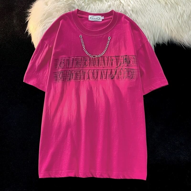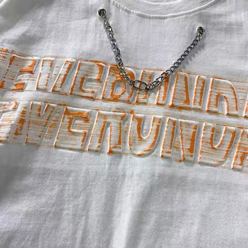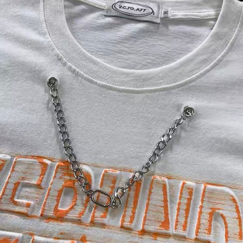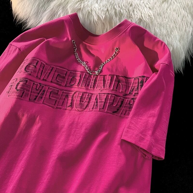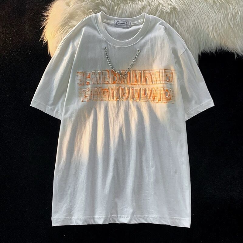 ロゴとチェーンネックレスがインパクトある半袖Tシャツは1枚で着てキマるアイテム。
