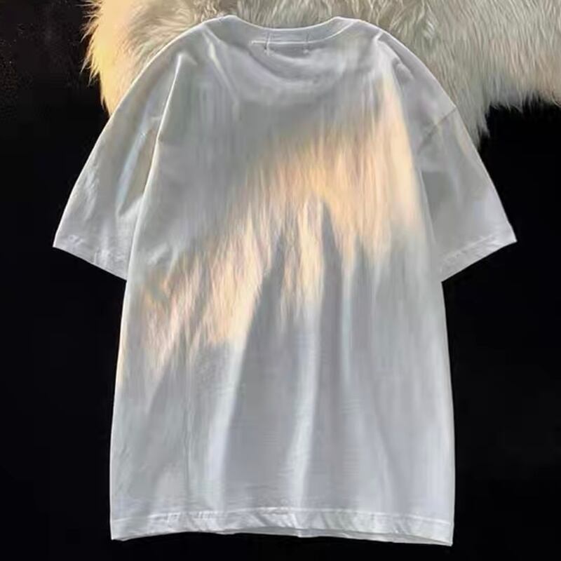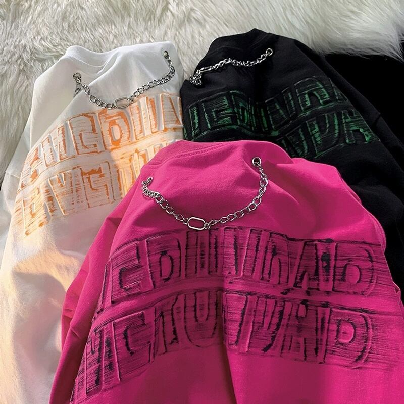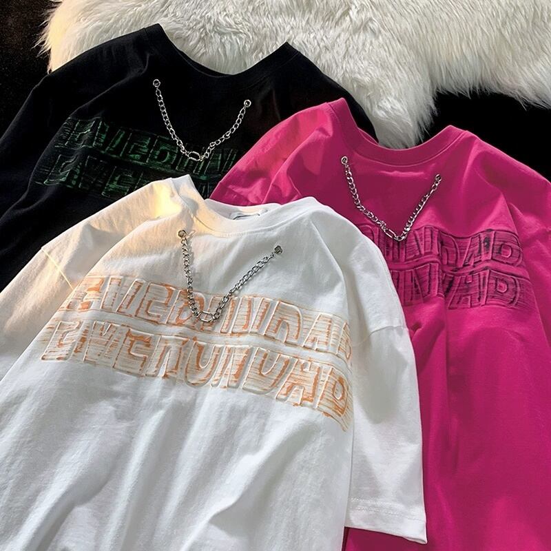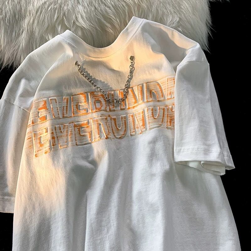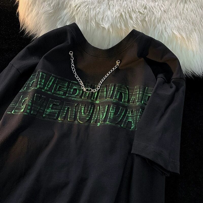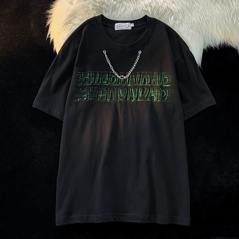 ロゴとチェーンネックレスがインパクトある半袖Tシャツは1枚で着てキマるアイテム。