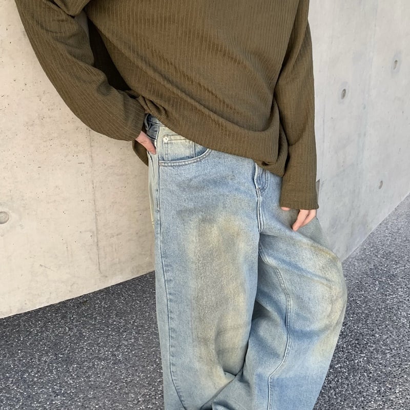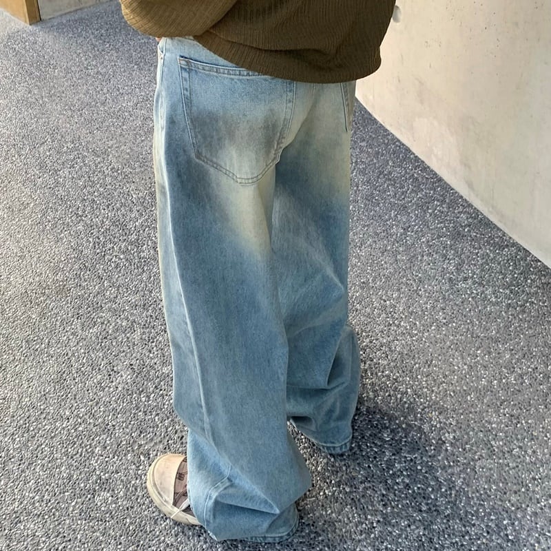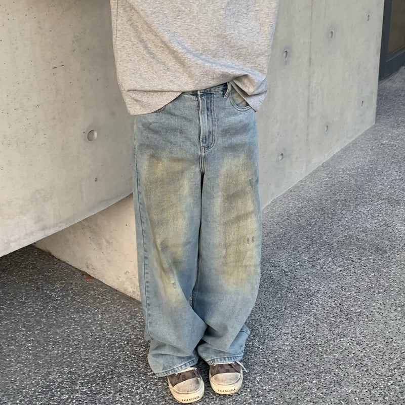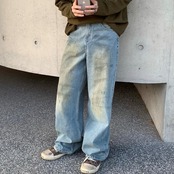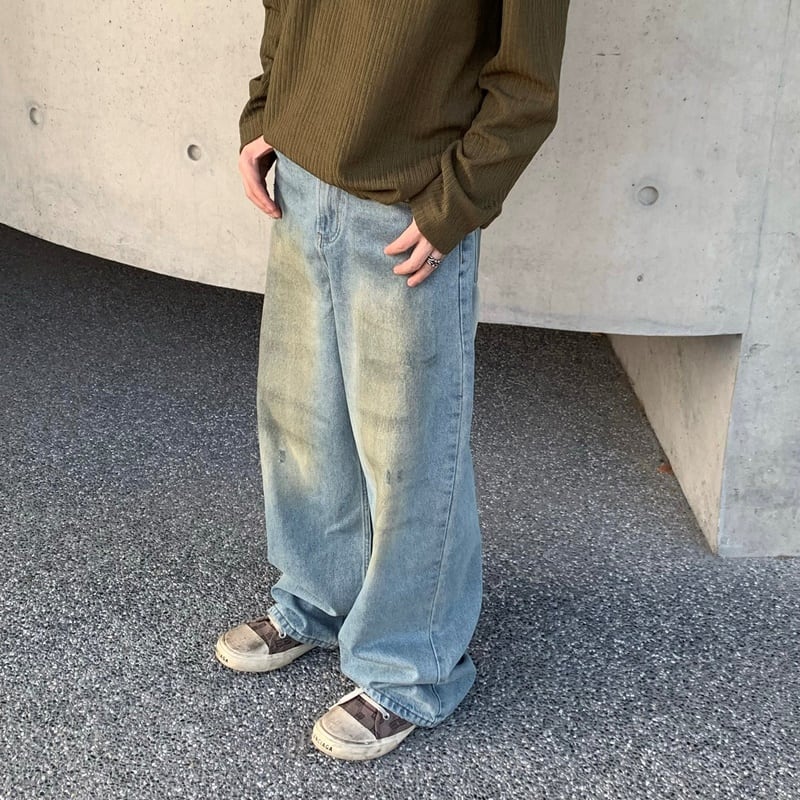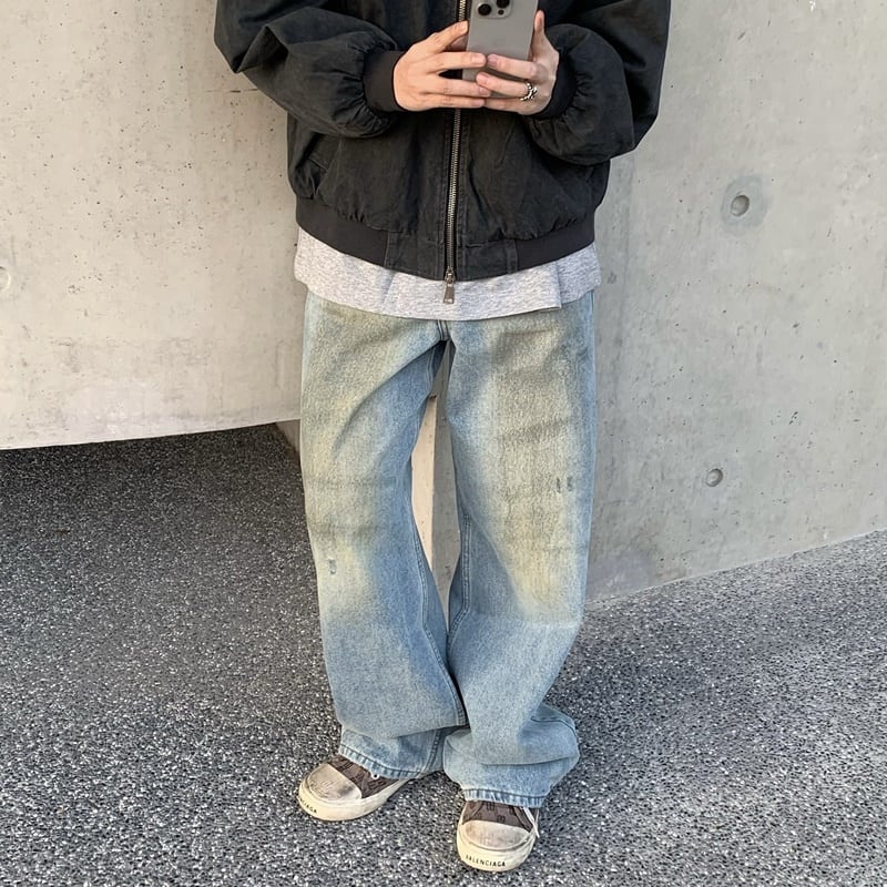 ルーズシルエットとダメージ感、長めの丈感がラフなオシャレを完成させるストレートワイドデニム。