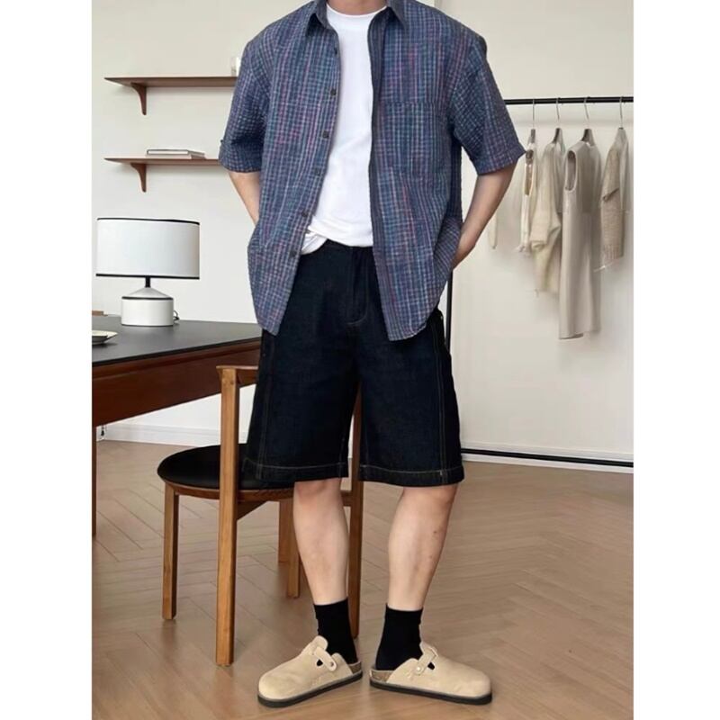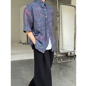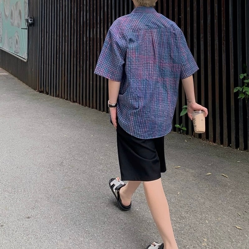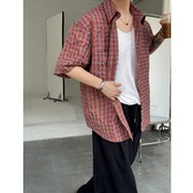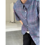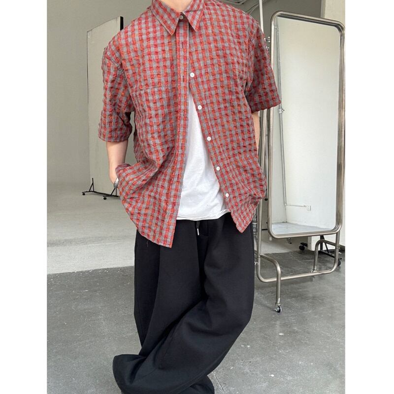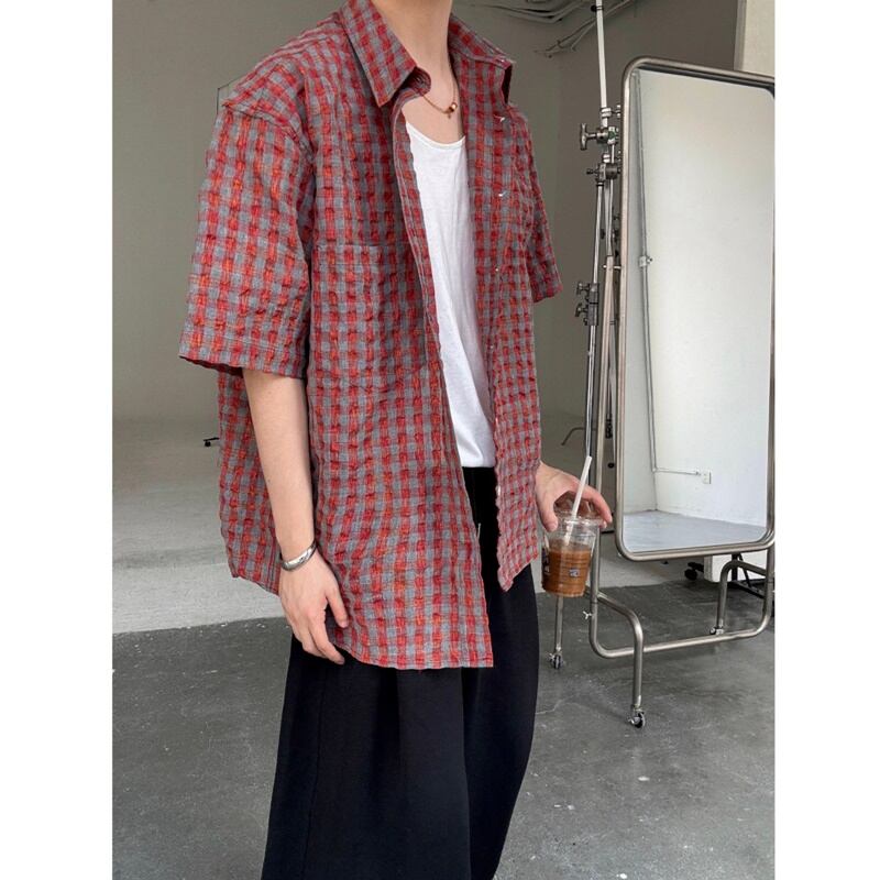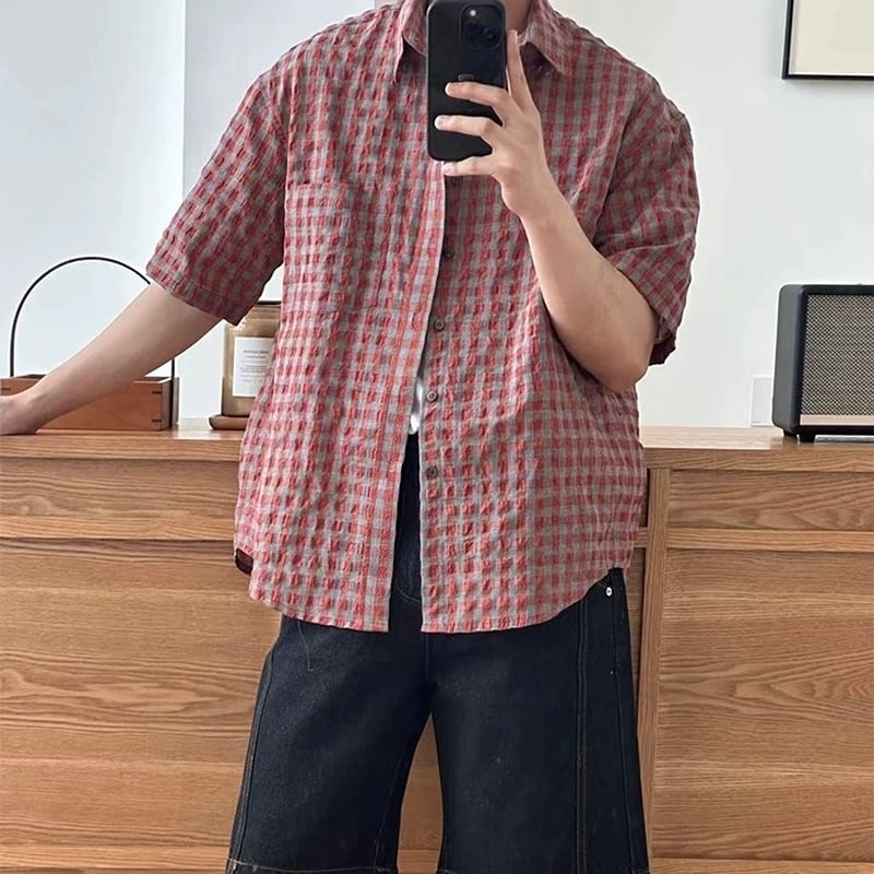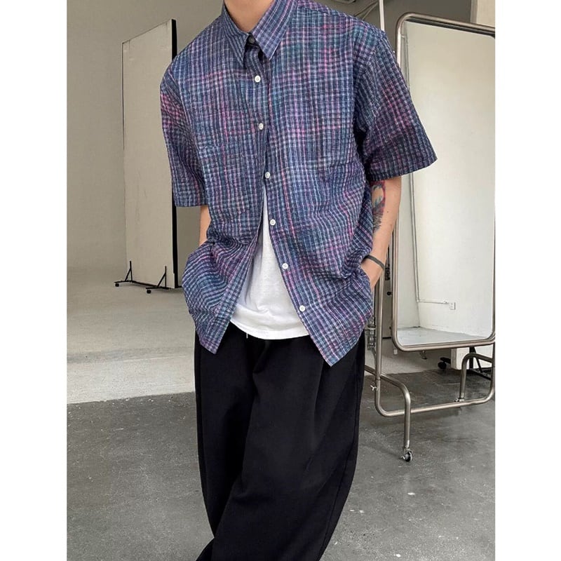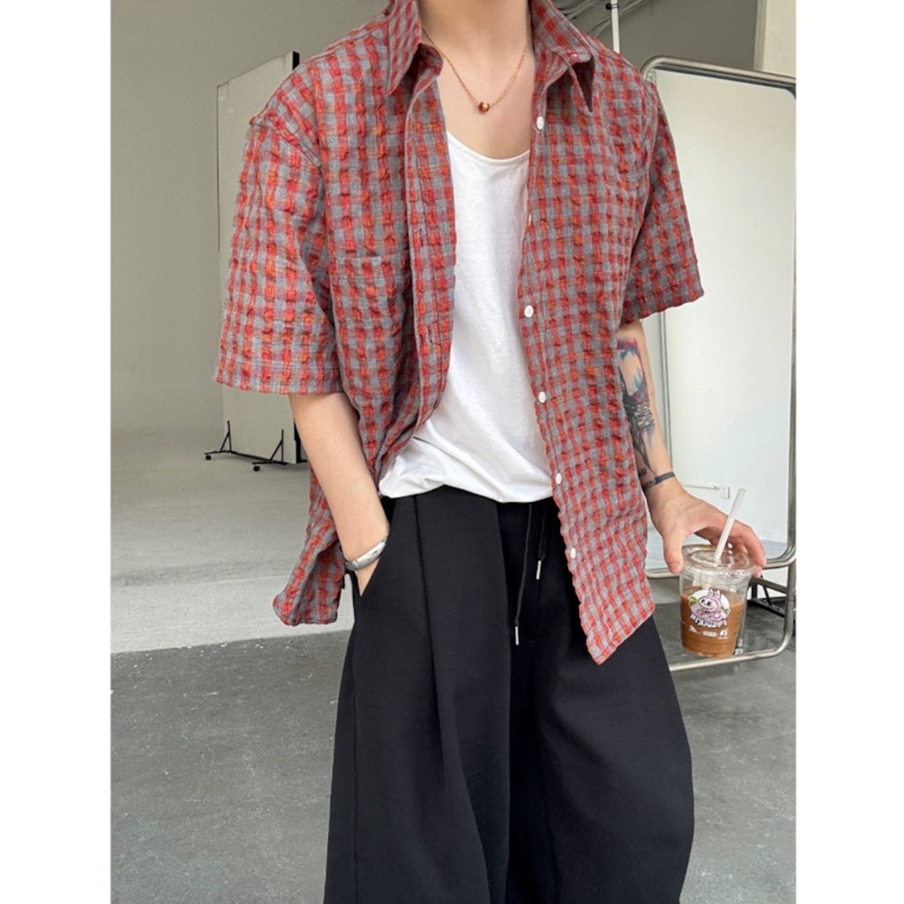 凹凸のある素材で仕立てられたチェックの半袖シャツ。