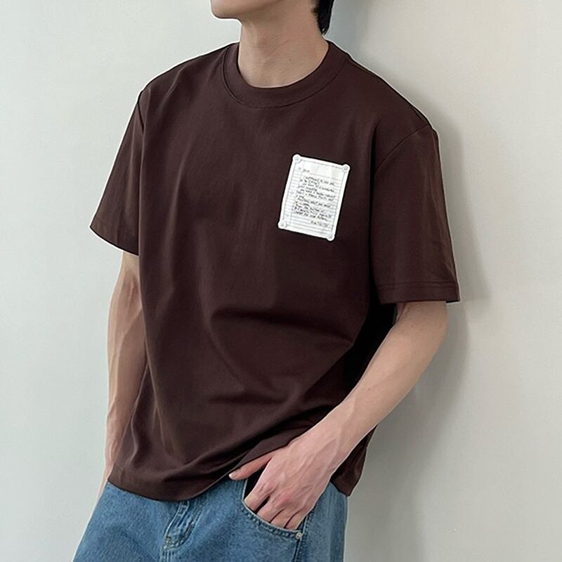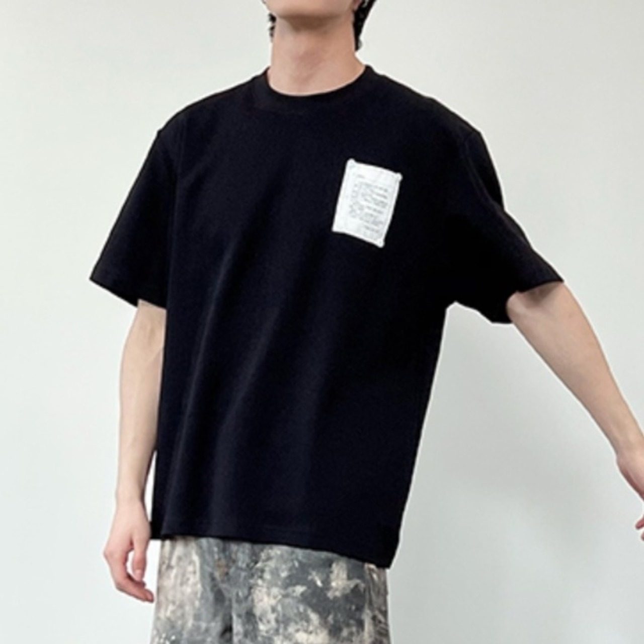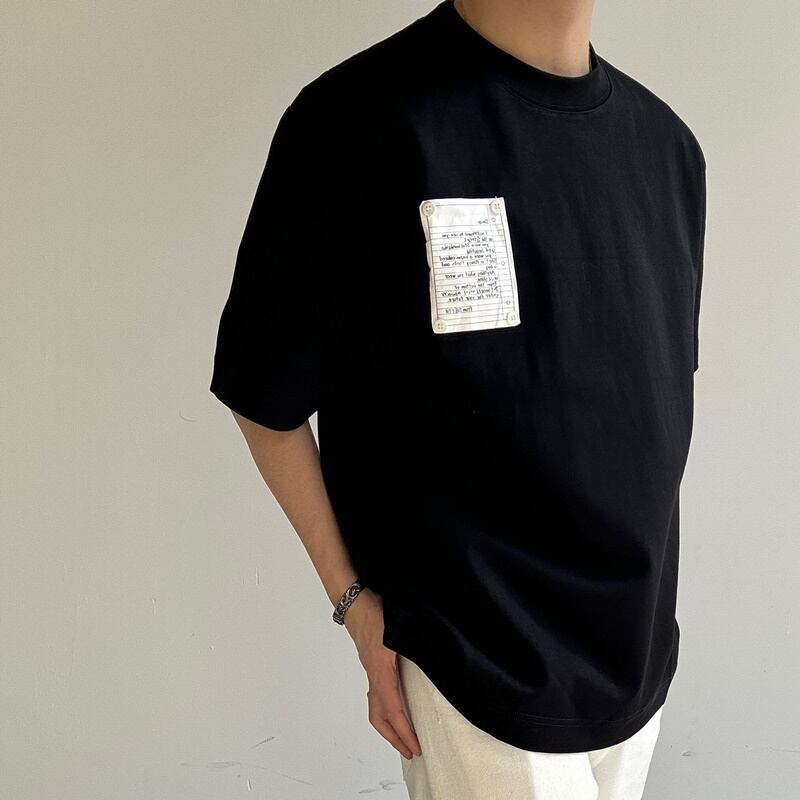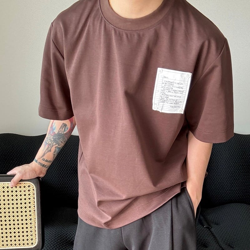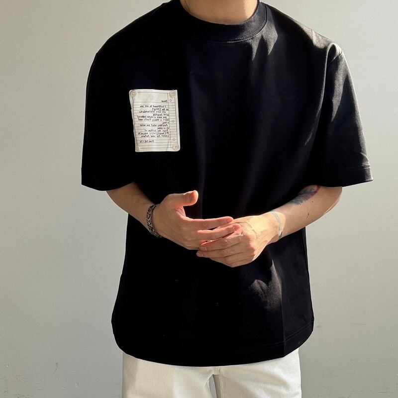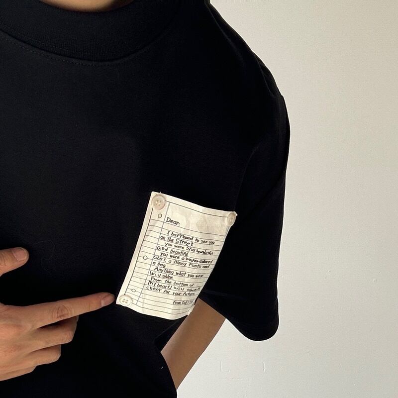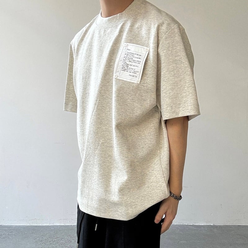 手書きのメモをボタンで留めたデザインがポイントの半袖Tシャツ。