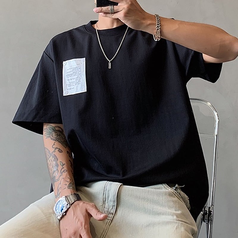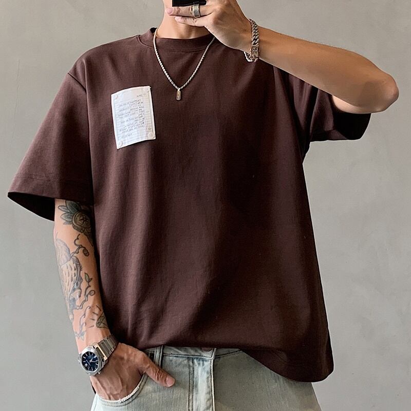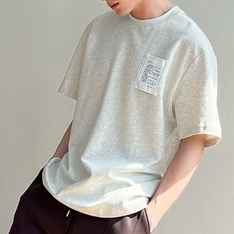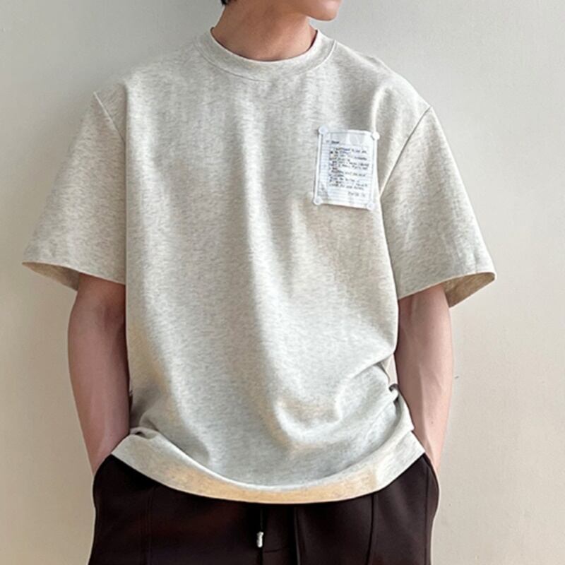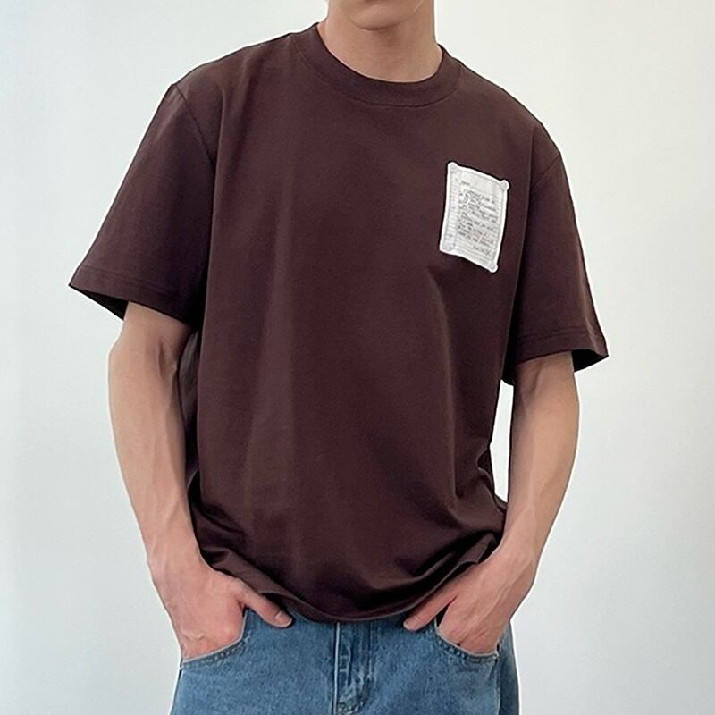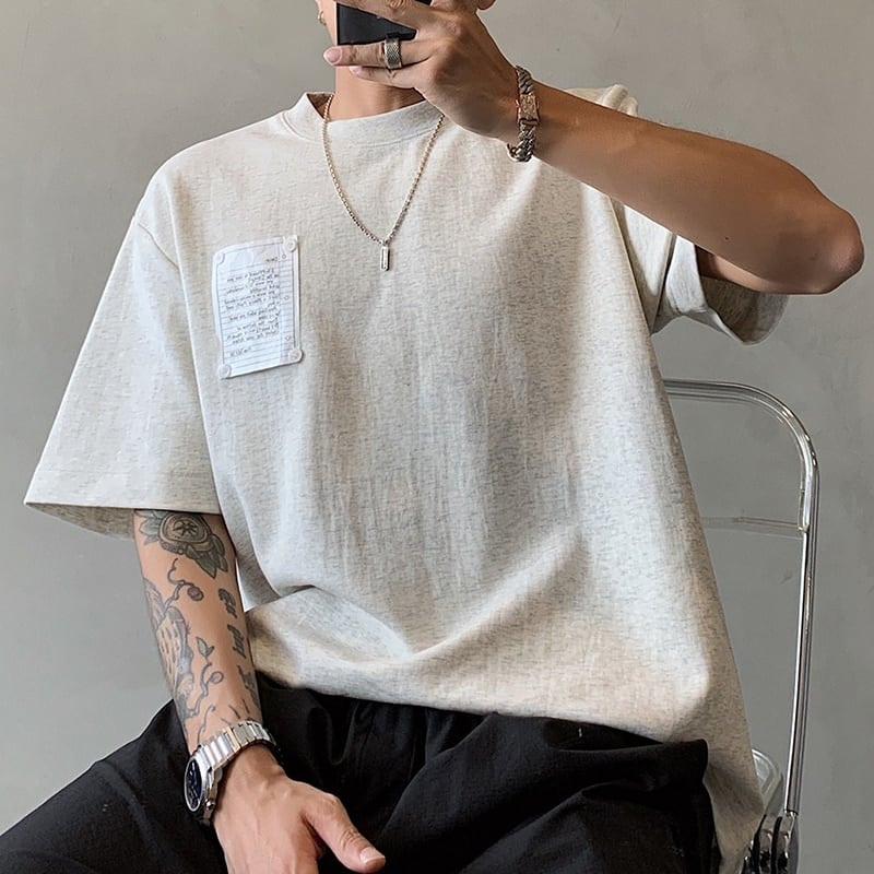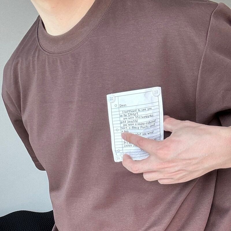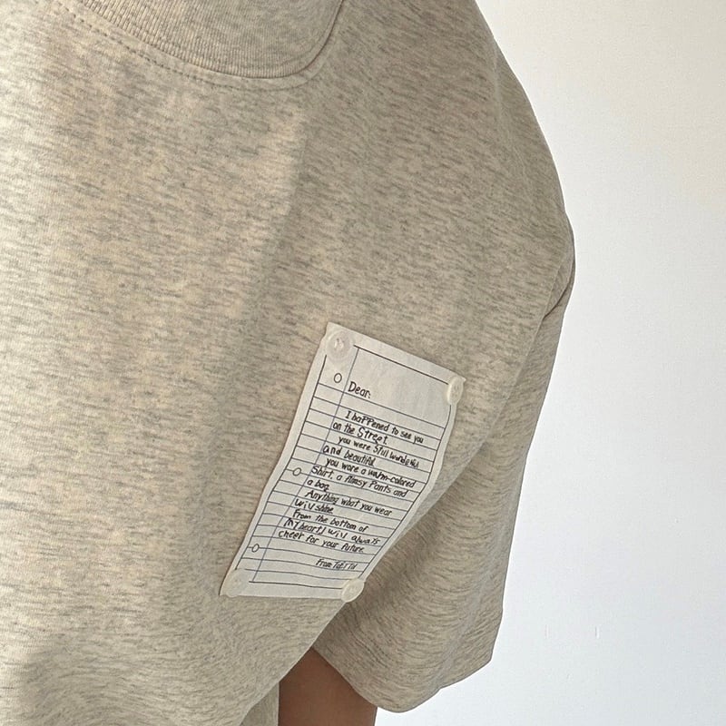 手書きのメモをボタンで留めたデザインがポイントの半袖Tシャツ。