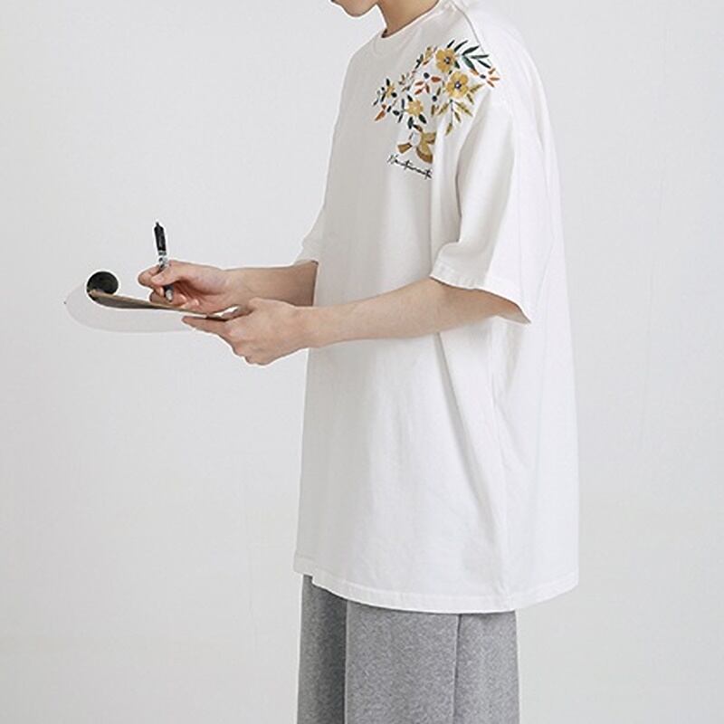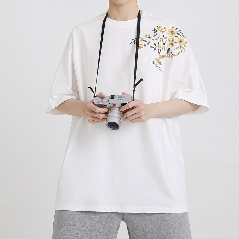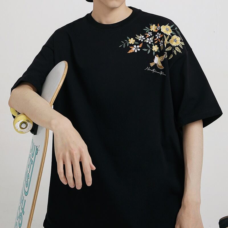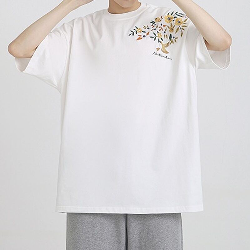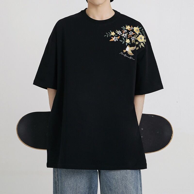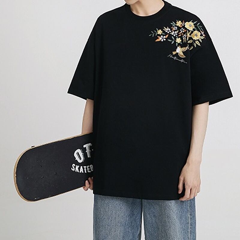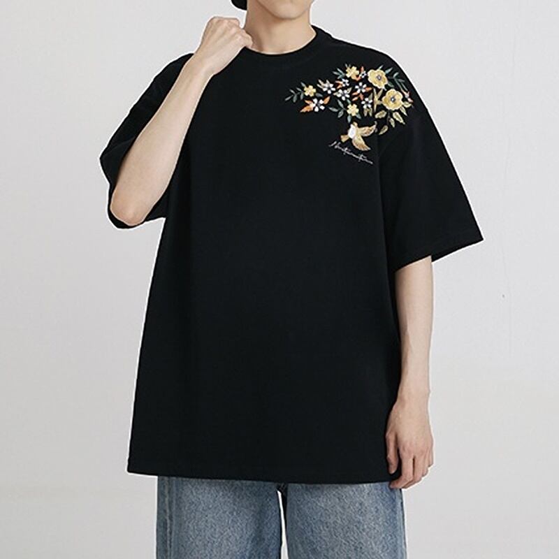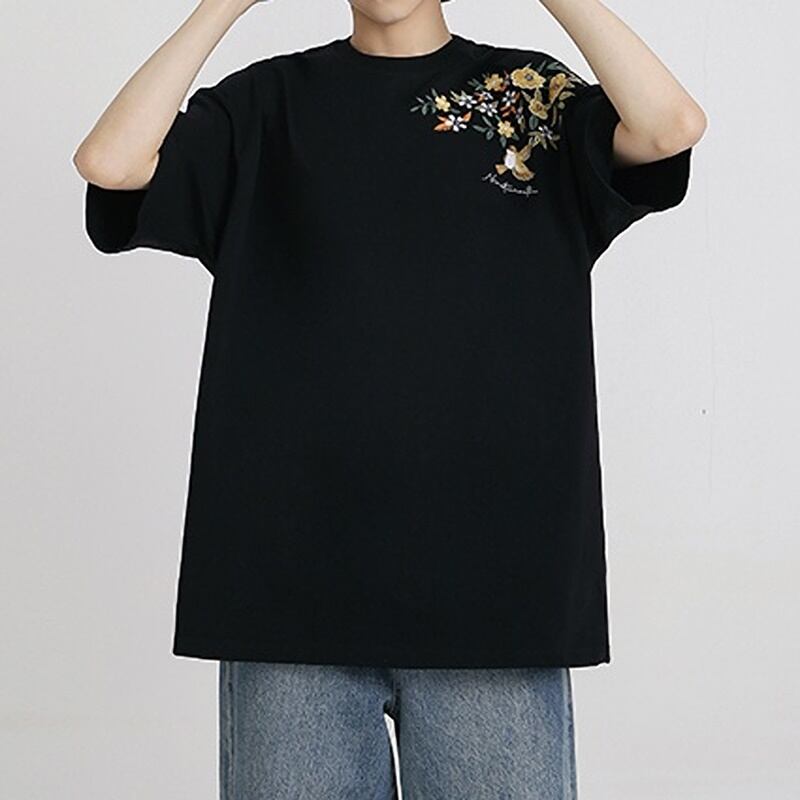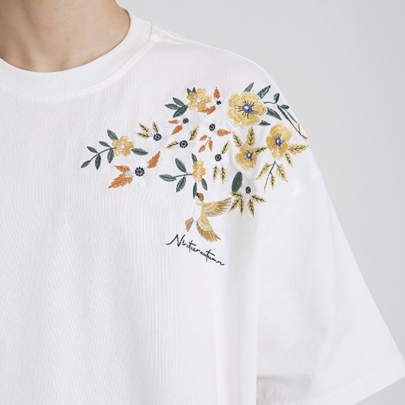 肩に入った刺繍デザインが存在感抜群な映えTシャツ。