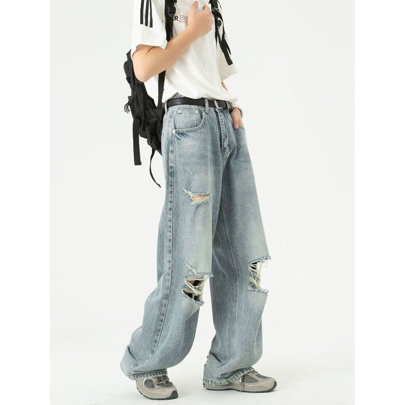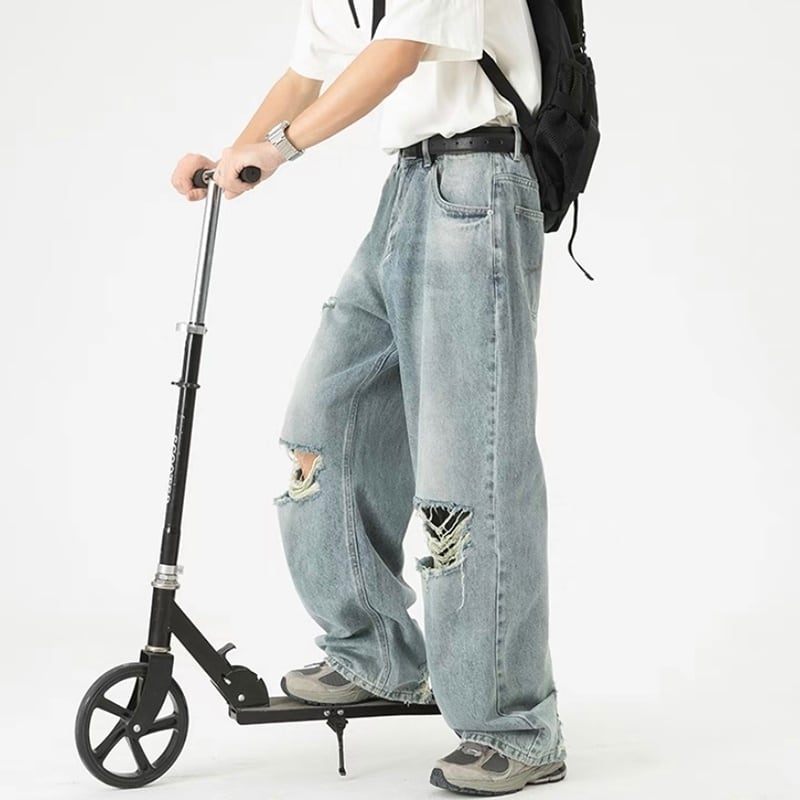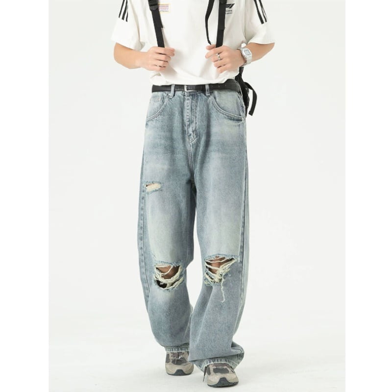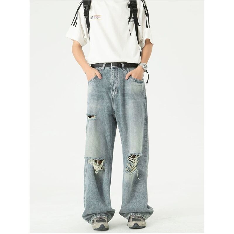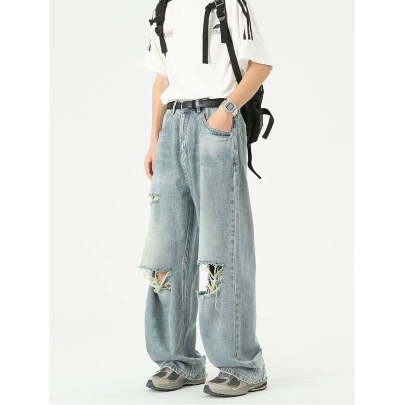 両ひざのハードな裂け具合が際立つリップドデニムパンツ。