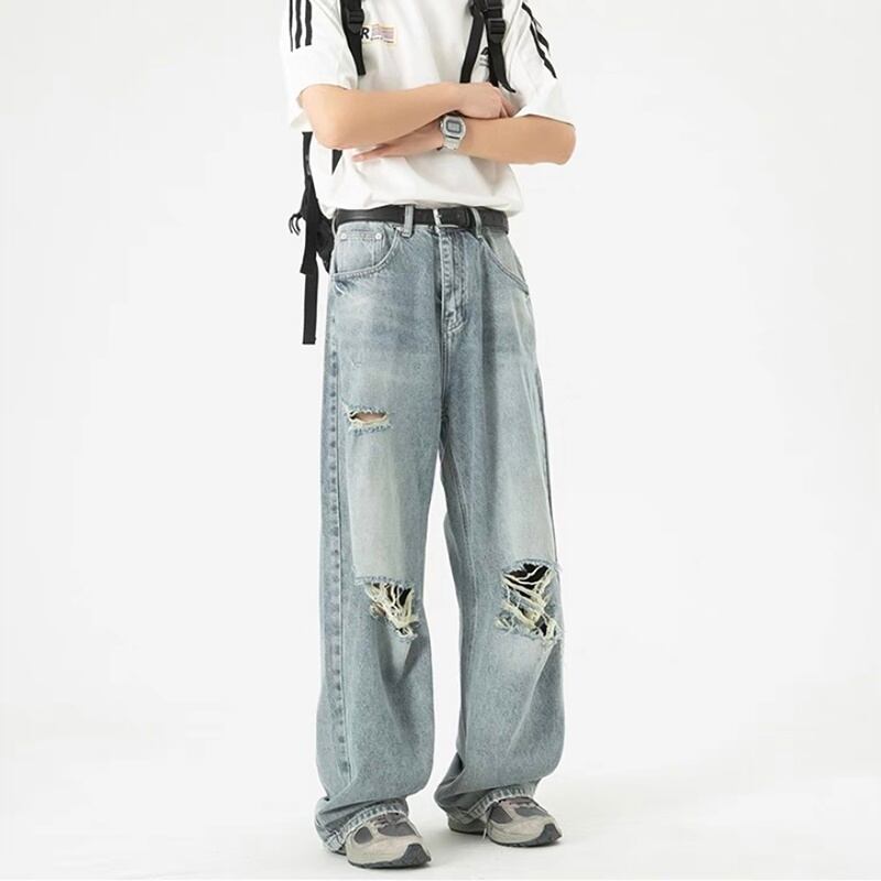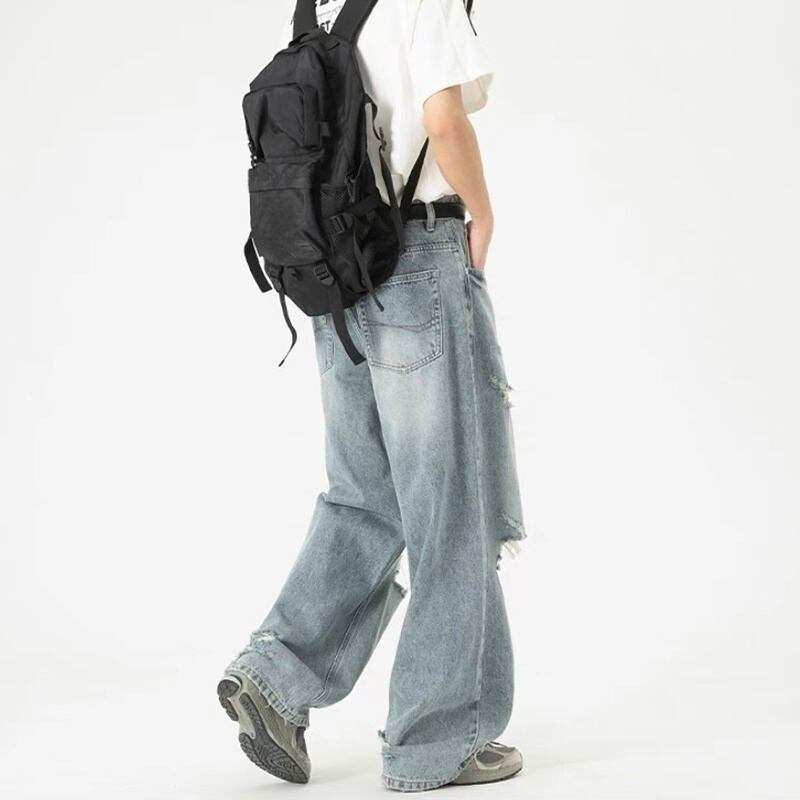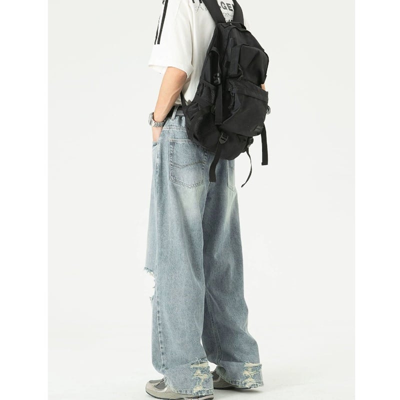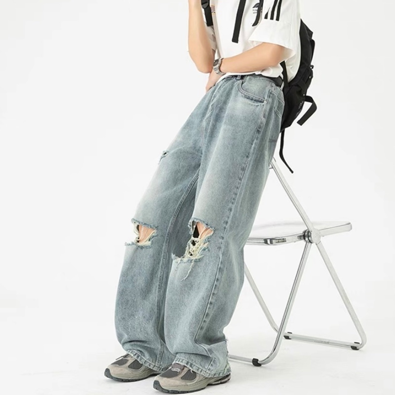 両ひざのハードな裂け具合が際立つリップドデニムパンツ。