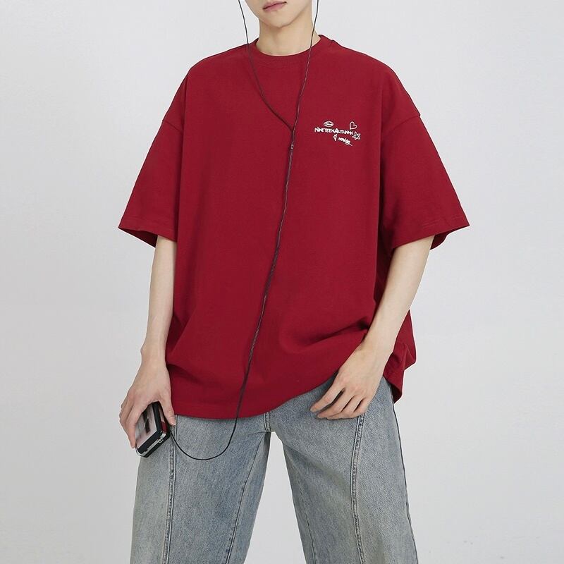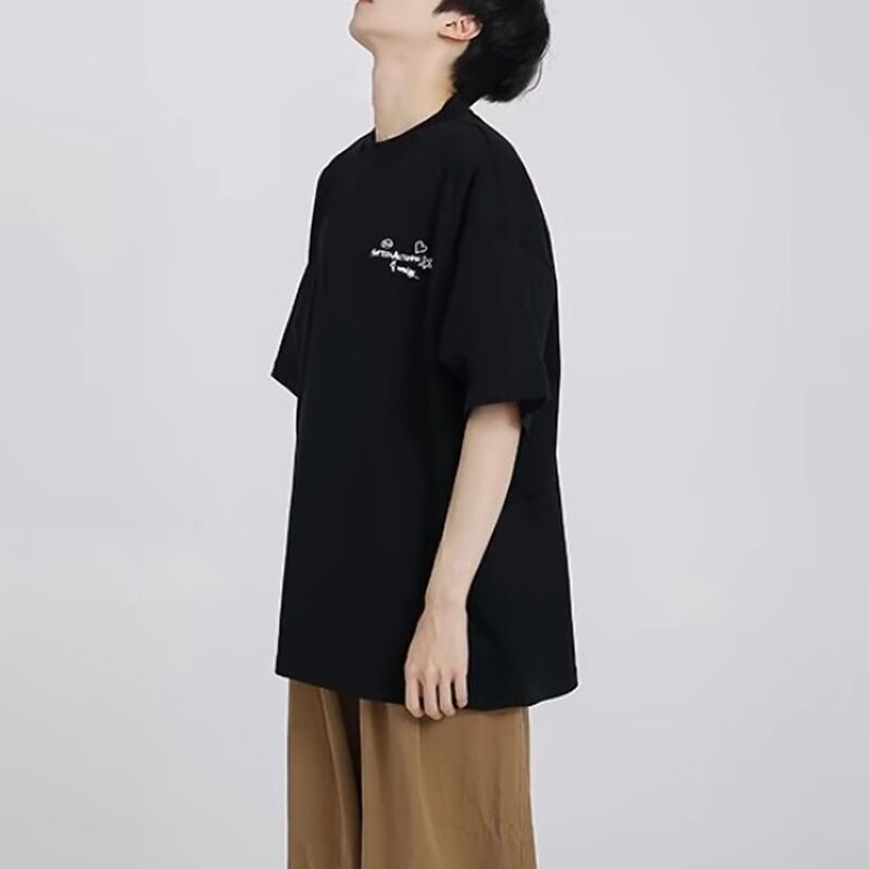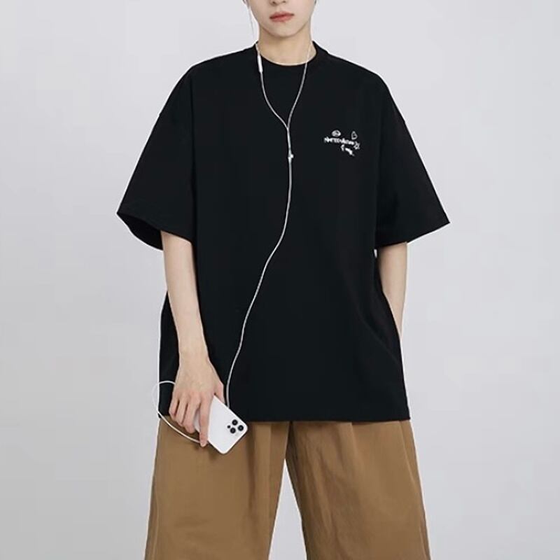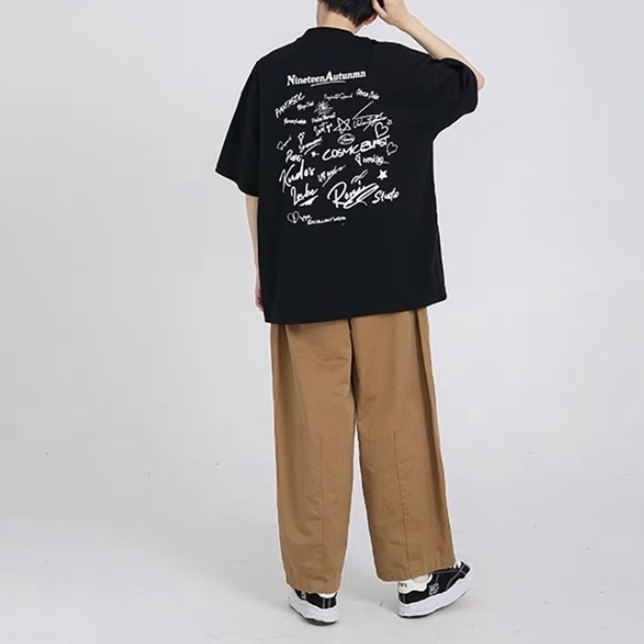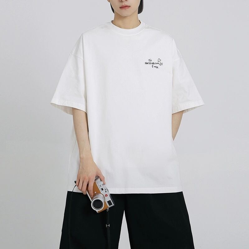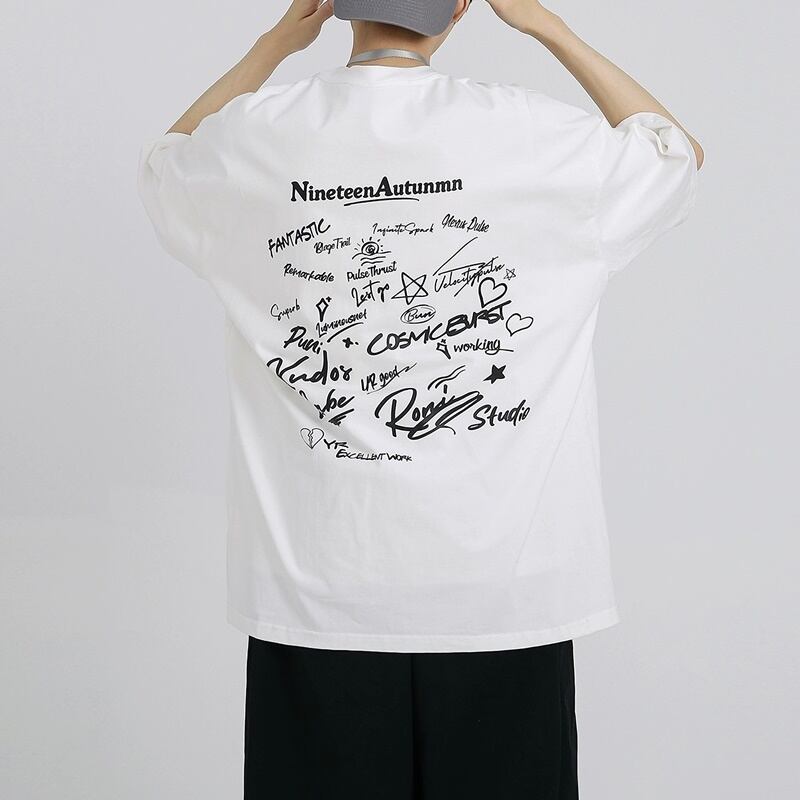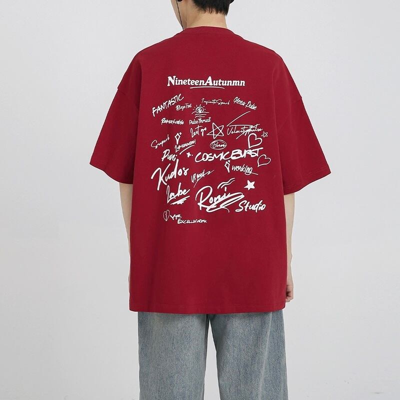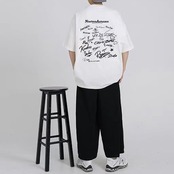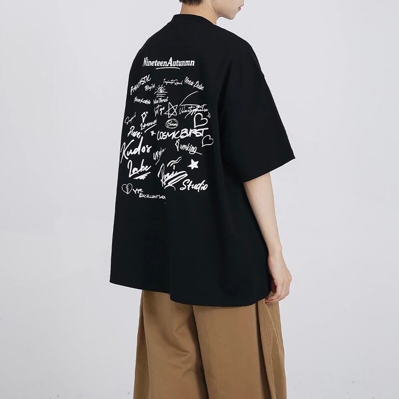 胸元とバックにレタープリントがあしらわれた半袖Tシャツ。