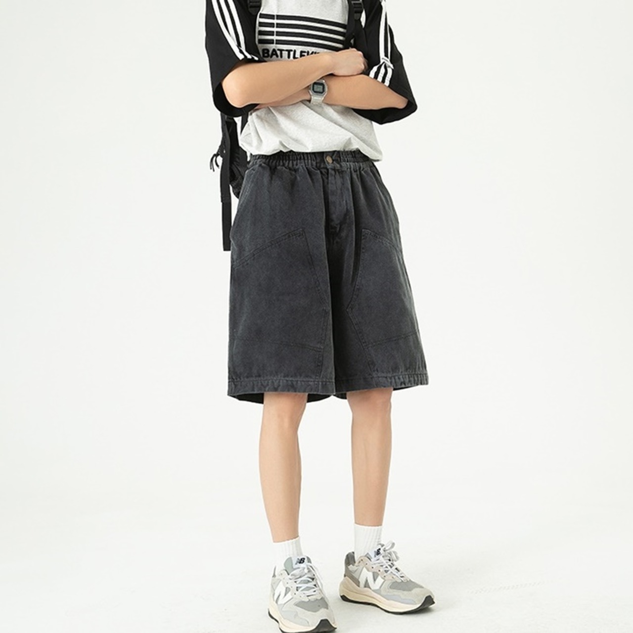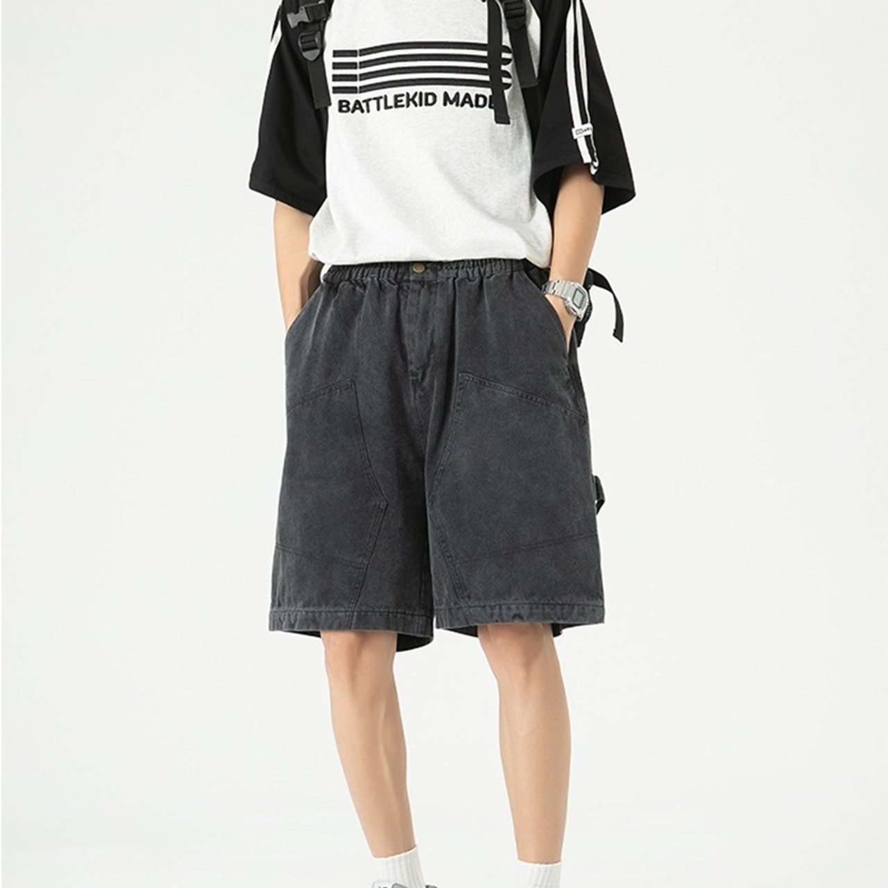 スッキリとしたデザインに個性的な切り替えが魅力的なハーフパンツです。