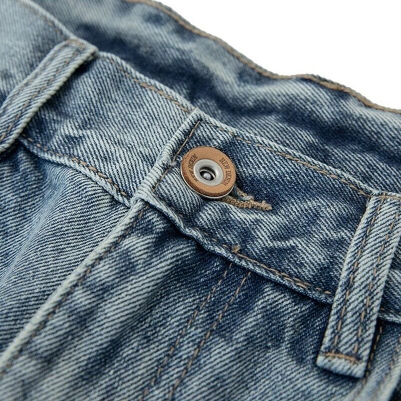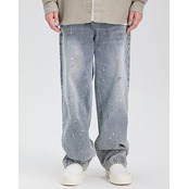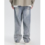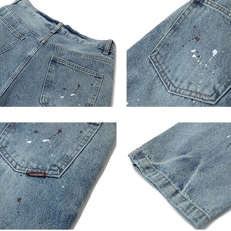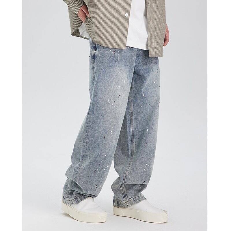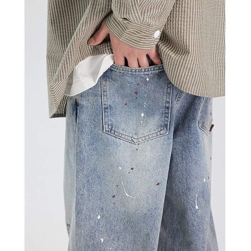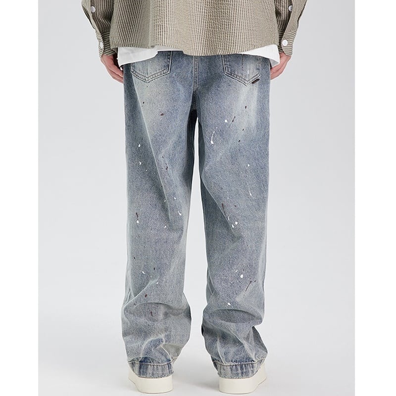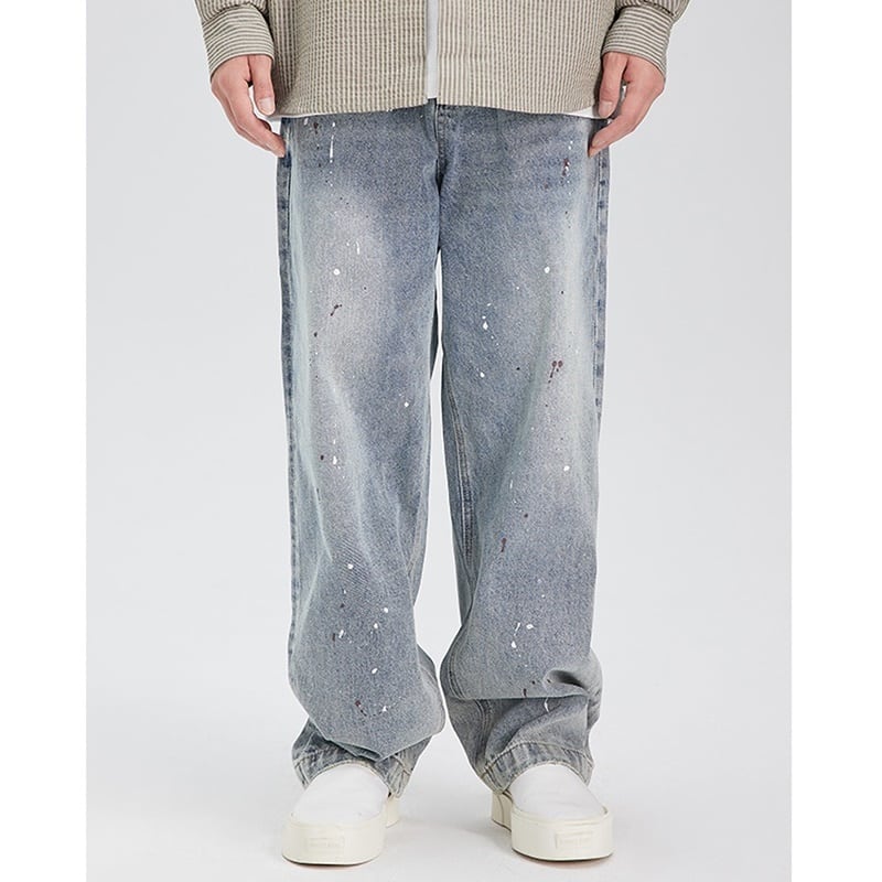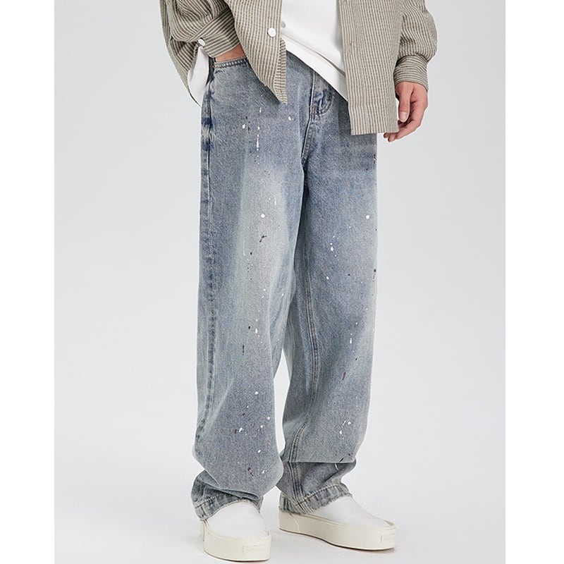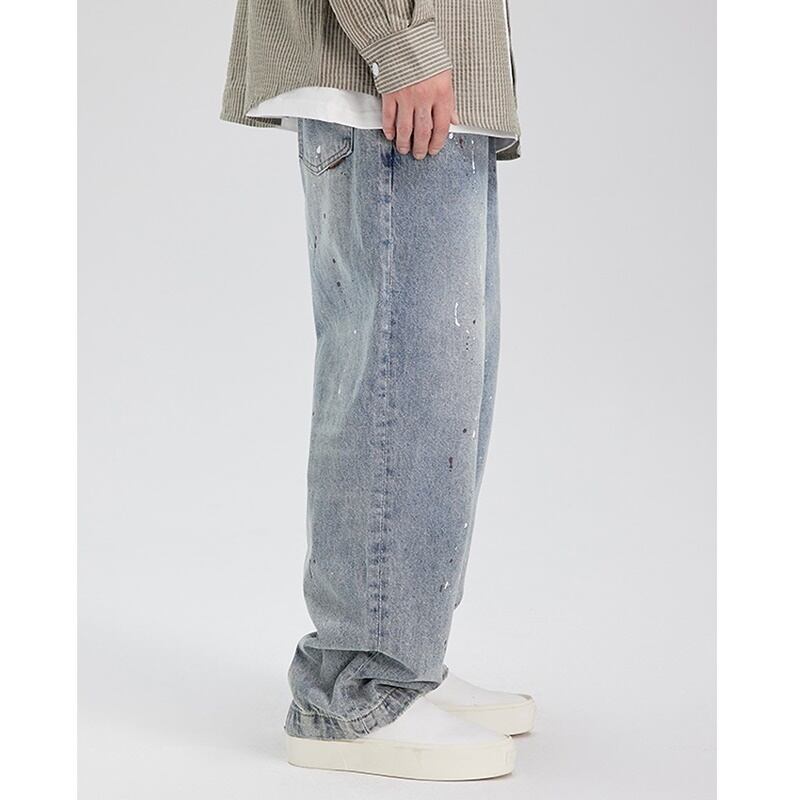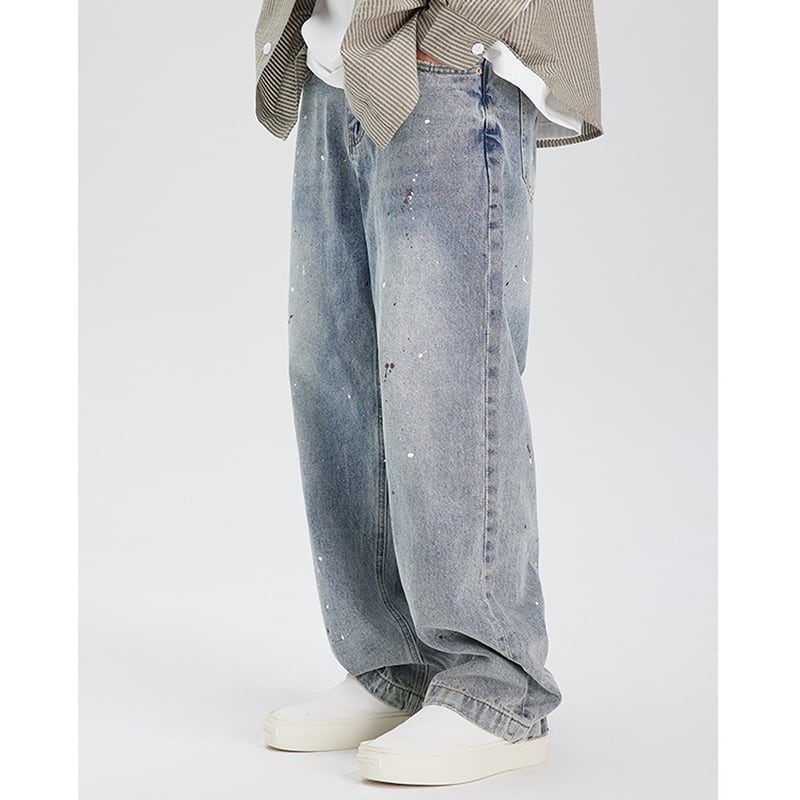 程よい色褪せ感に派手すぎないスプラッシュペイント加工がオシャレ見えするワイドデニム。