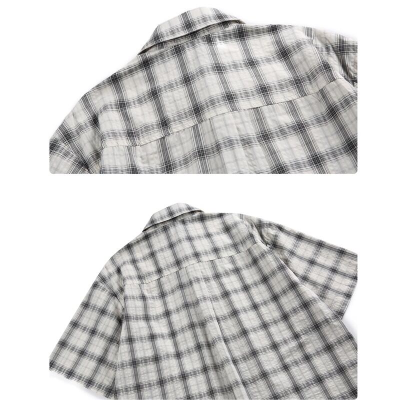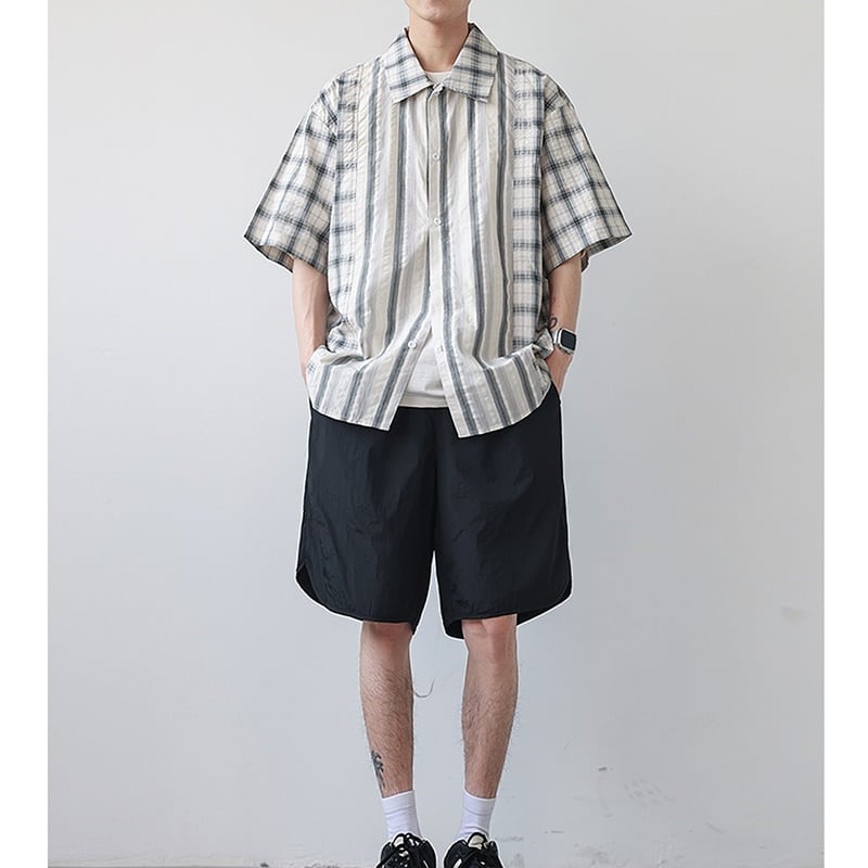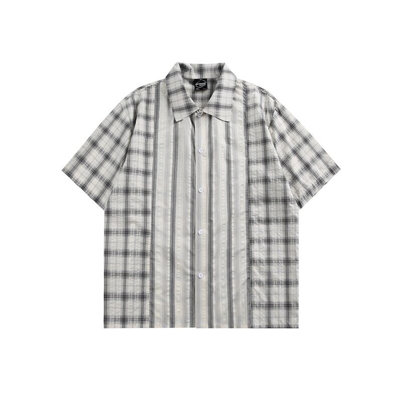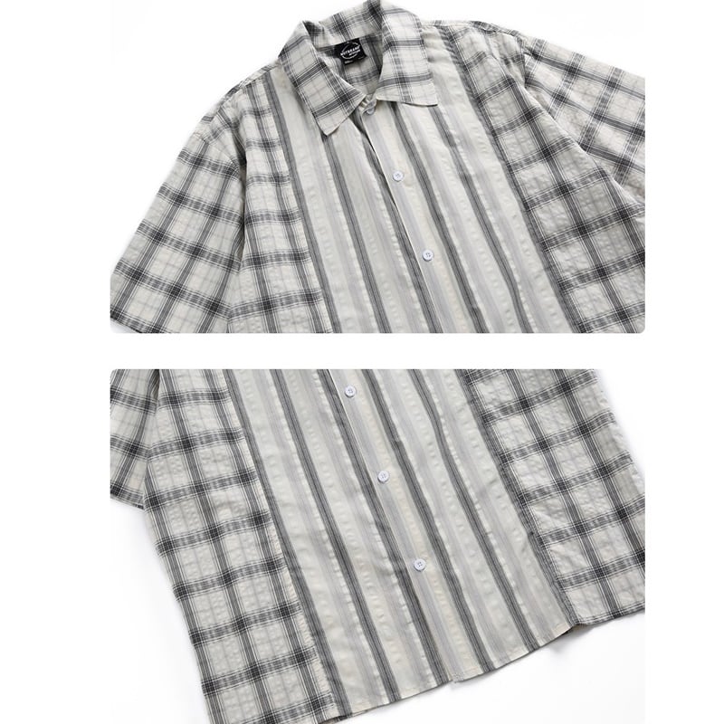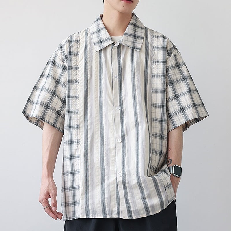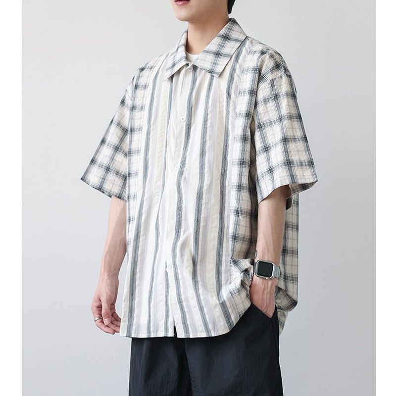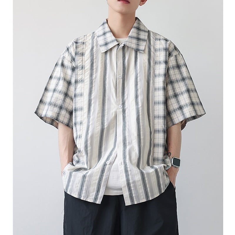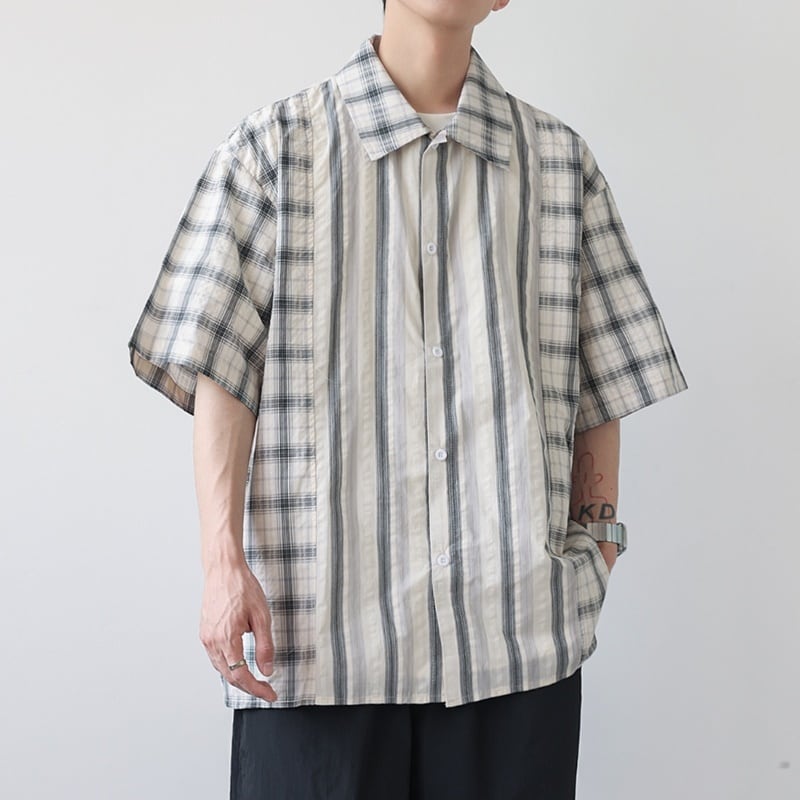 チェック柄とストライプ柄がバランスよくデザインされた半袖シャツ。
