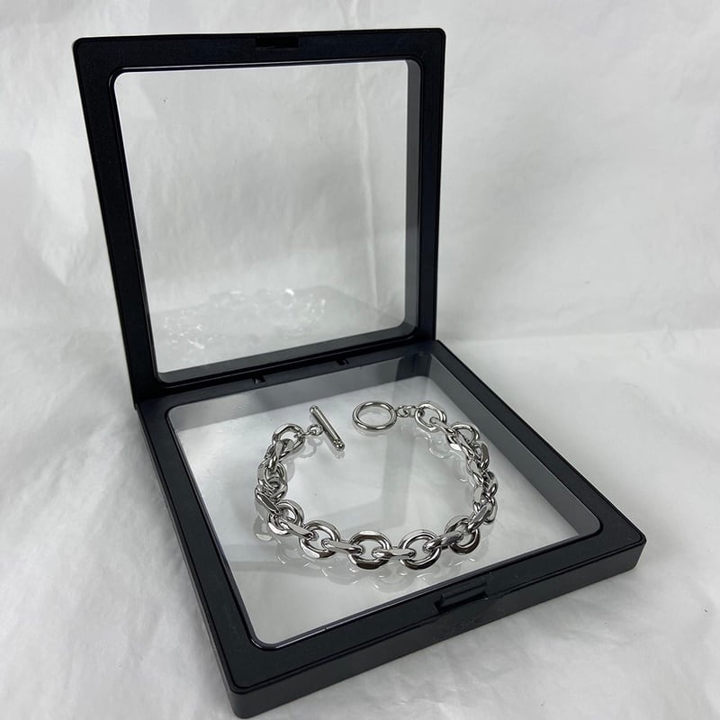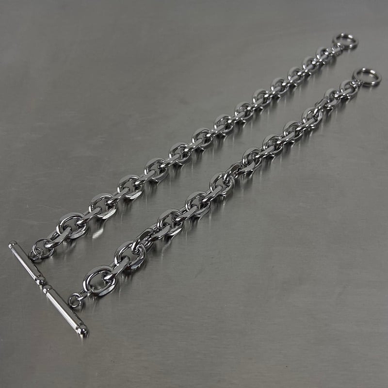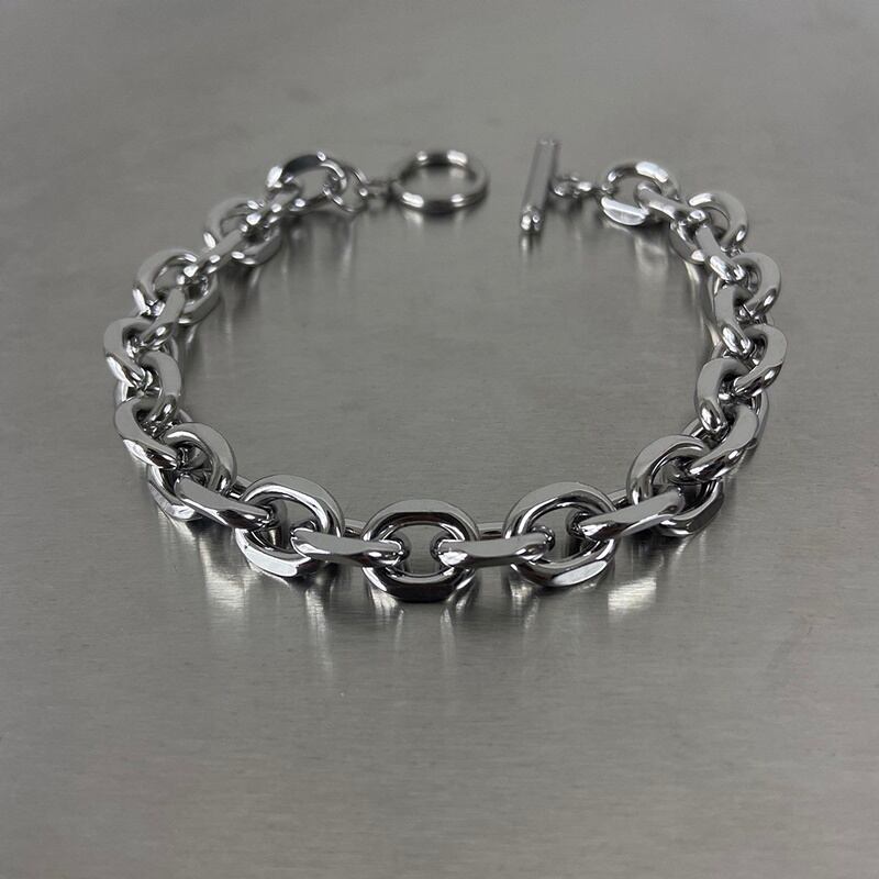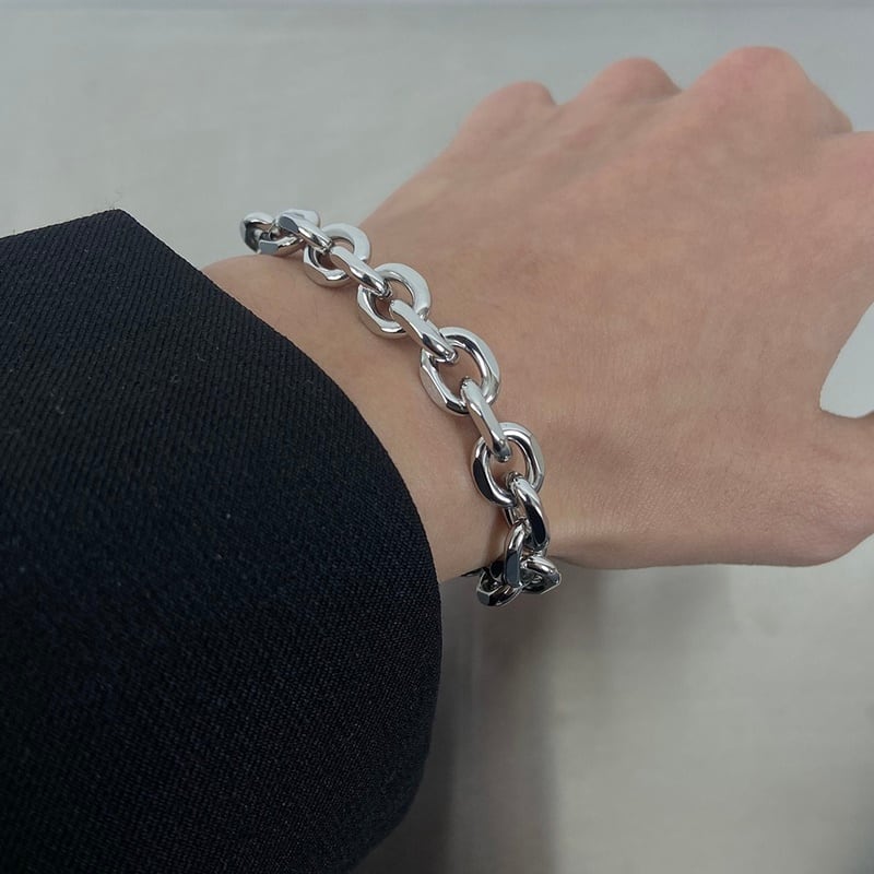 丸みを帯びたチェーンのデザインがソフトな雰囲気を持ちつつボリュームあるマンテルチェーンブレスレット。