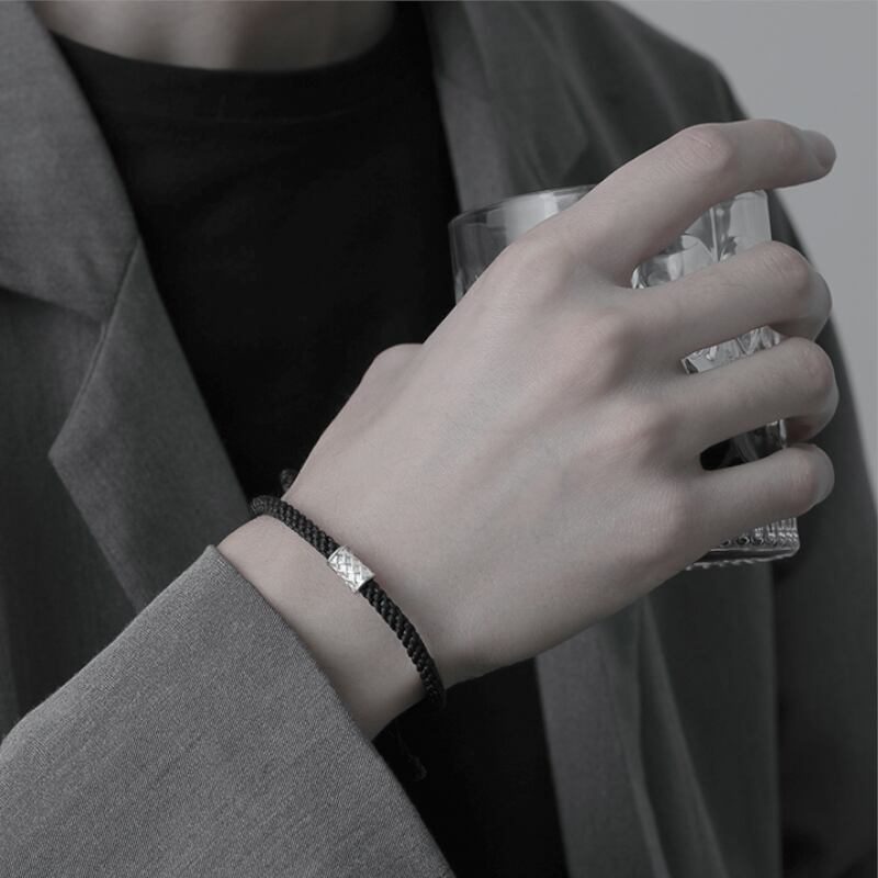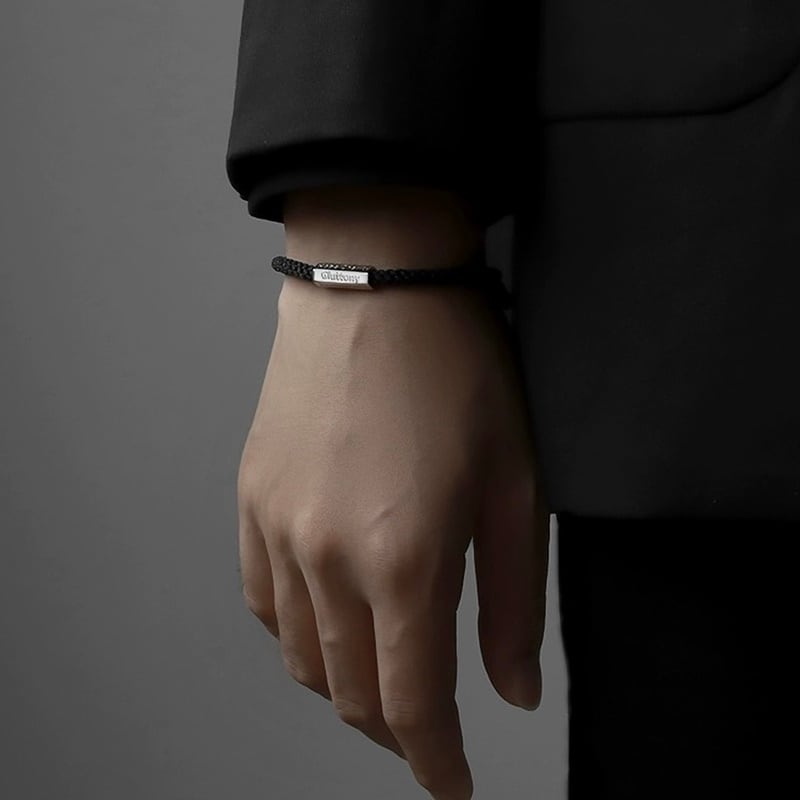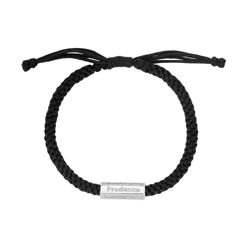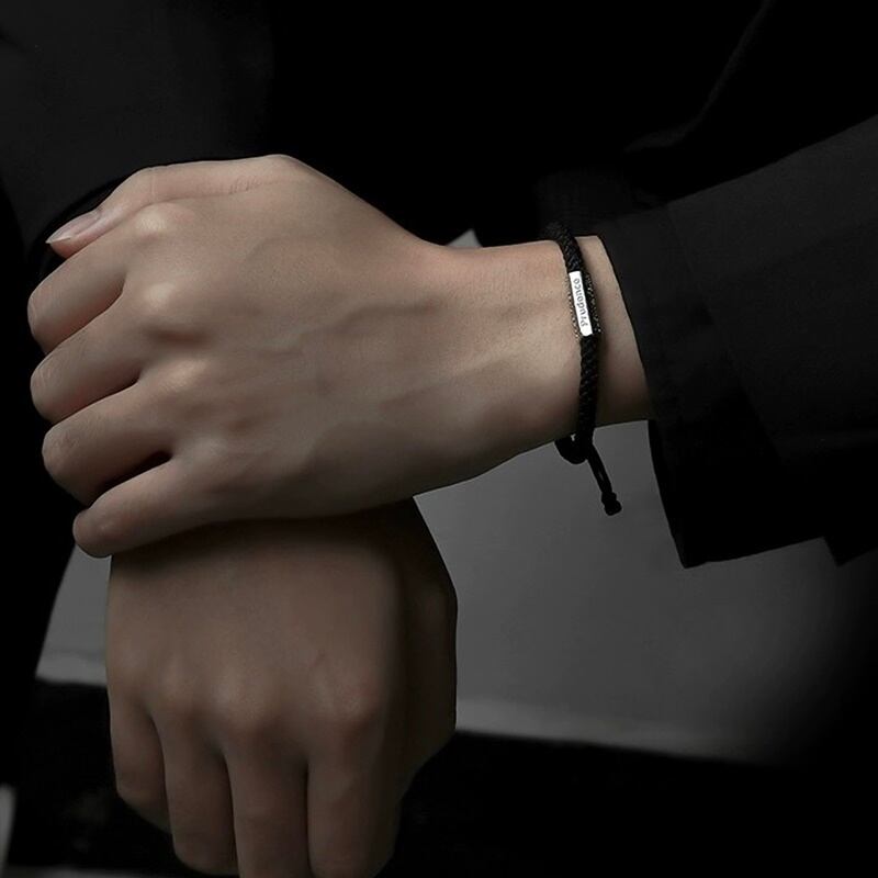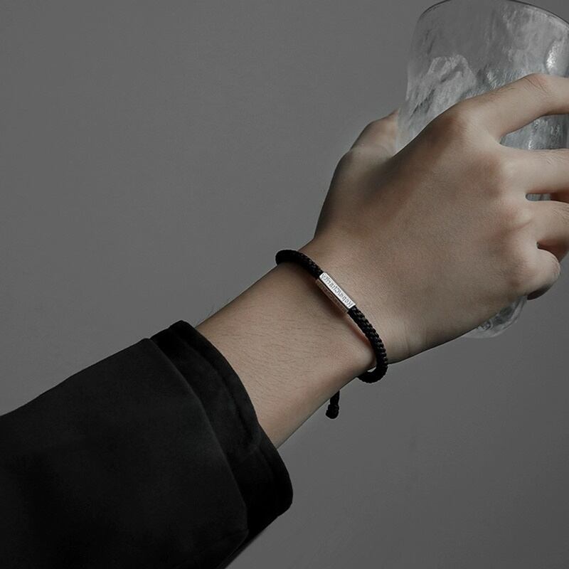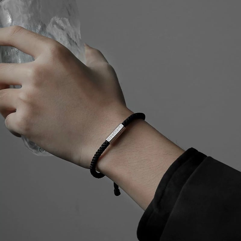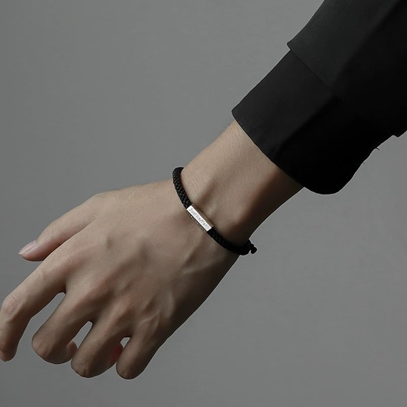 メッセージ刻印のパーツを入れコードを編んで仕上げられたブレスレットです。