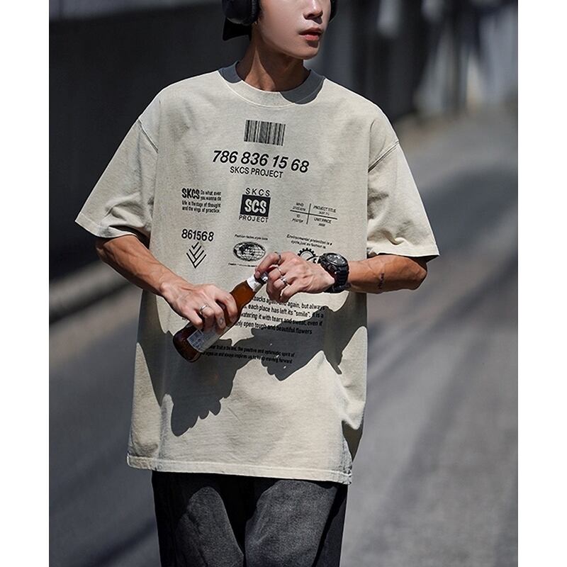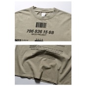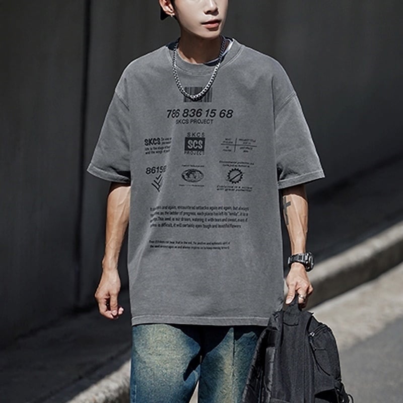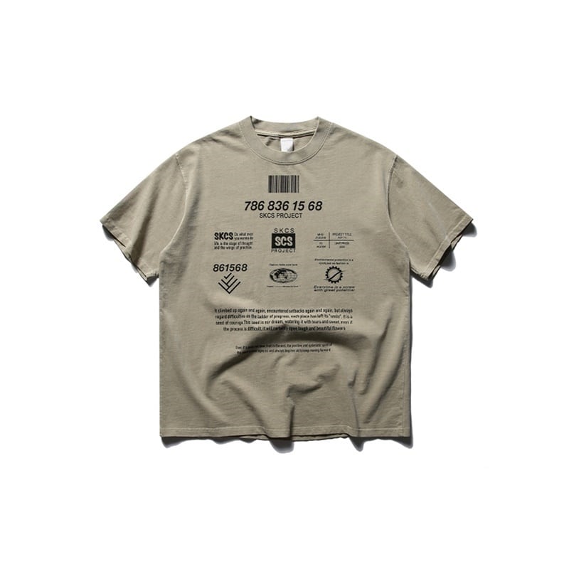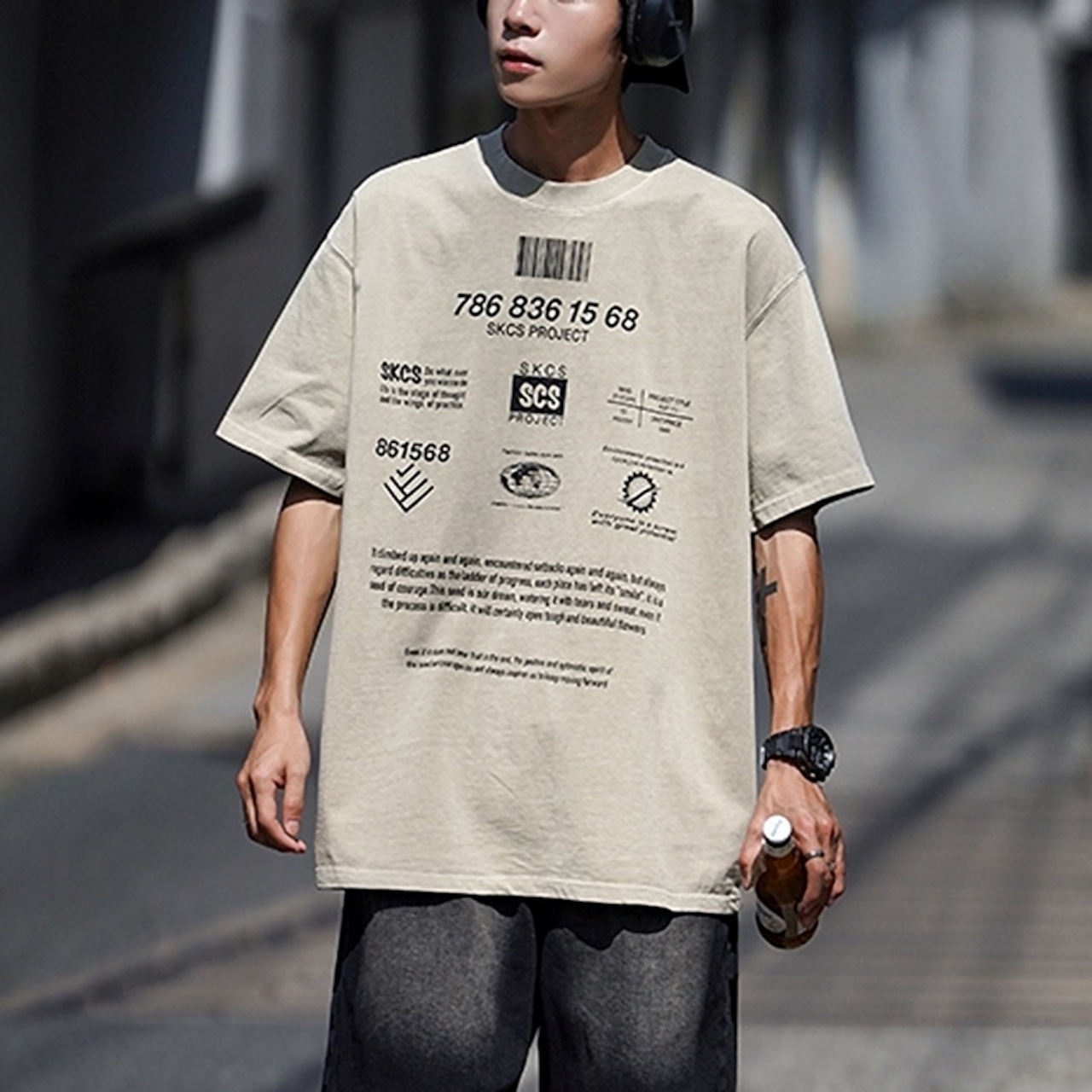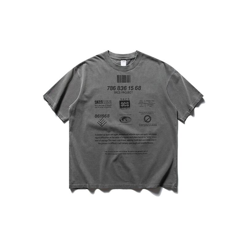 バーコードや地球のイラストなど全体に様々なプリントが配置された個性的なTシャツ。